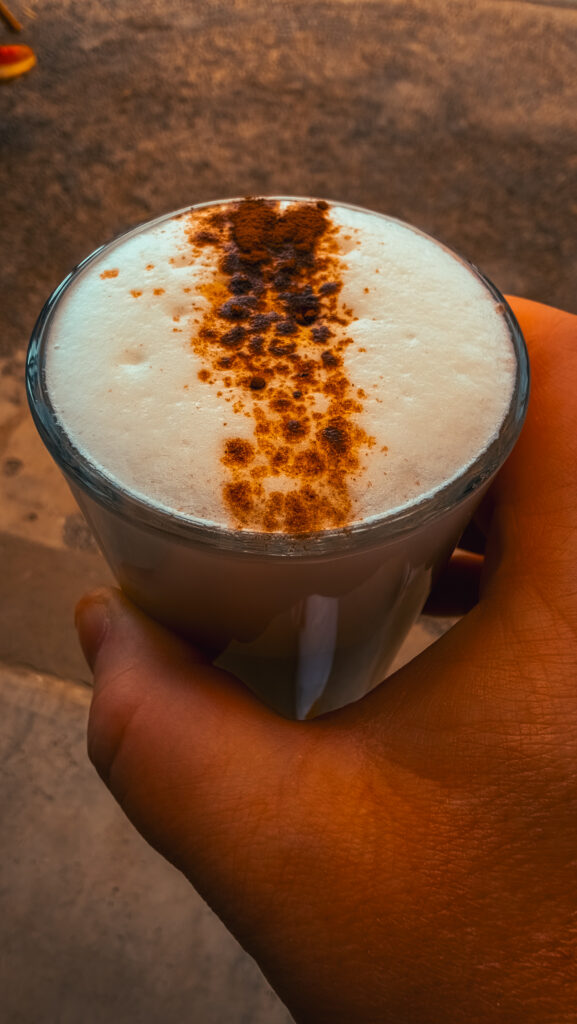Das ist kein „klassisches Café“, sondern eher so ein entspannter Surfer-Spot. Alles wirkt ein bisschen langsamer, ein bisschen lockerer. Man sitzt da, schaut Richtung Meer, irgendwo laufen Leute barfuß rum – und keiner hat es eilig.